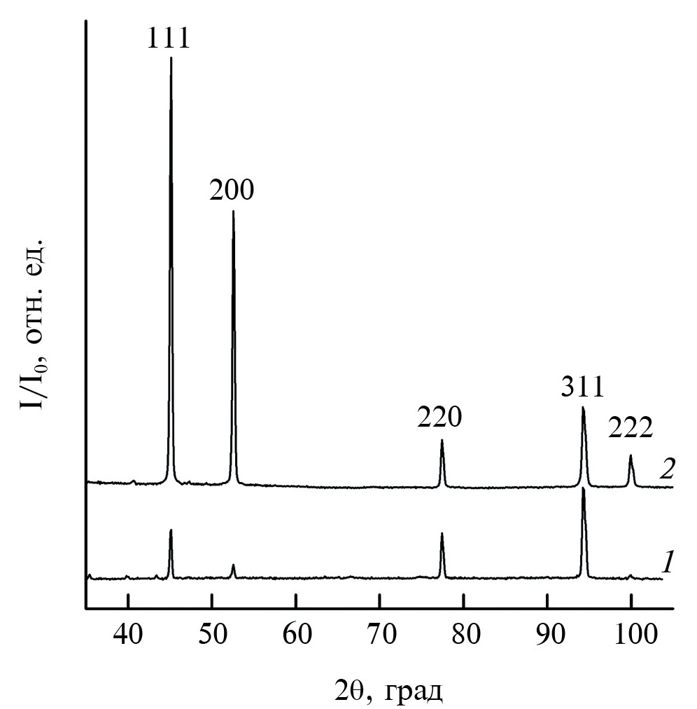 Рис. 1. Дифрактограммы Al фольги в исходном состоянии (1) и после деформации – поворота на 1 об. под давлением 2 ГПа (2)