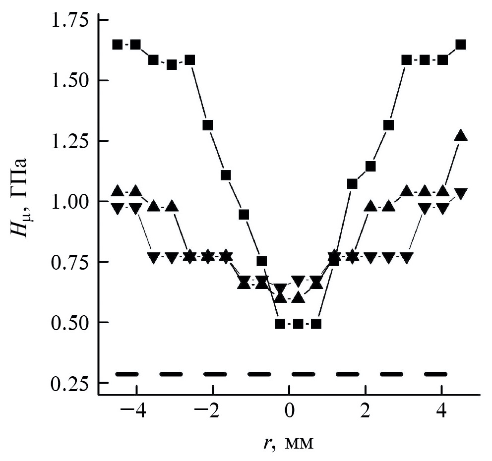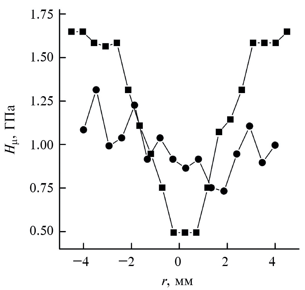 Как было установлено ранее [10], консолидированные из фольг алюминиевые диски склонны к естественному старению, которое сопровождается снижением твердости. Проведенные в настоящей работе измерения твердости поверхности диска, деформированного кручением на 4 об. под давлением 4 ГПа и состаренного в течение года, показали (рис. 3), что распределение твердости становится более однородным за счет снижения H на периферии и подрастания в центральной части. Среднее значение твердости снижается от 1.2 до 0.98 ГПа.