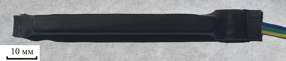 Схема детектора показана на рис. 1. Для улучшения параметров сбора света по краям световода изготовлены сверхширокоугольные объективы с целенаправленно увеличенной дисторсией, которые заполнены клеем типа “оптический цемент” EJ-500 (в результате получаются линзы типа “рыбий глаз”). Сцинтиллятор также прикреплен к световоду клеем типа “оптический цемент”. В дальнейшем, после полного отвердевания клея, один образец детектора покрывали диффузионной отражающей лентой фторопласт-4, второй образец оставался без покрытия. Сделано это для того, чтобы изучить влияние покрытия на амплитуду сигналов в световоде. Для экранирования от внешнего света весь детектор покрывали термоусадочной непрозрачной черной трубкой с коэффициентом усадки 1:4. Внешний вид детектора показан на рис. 2.
