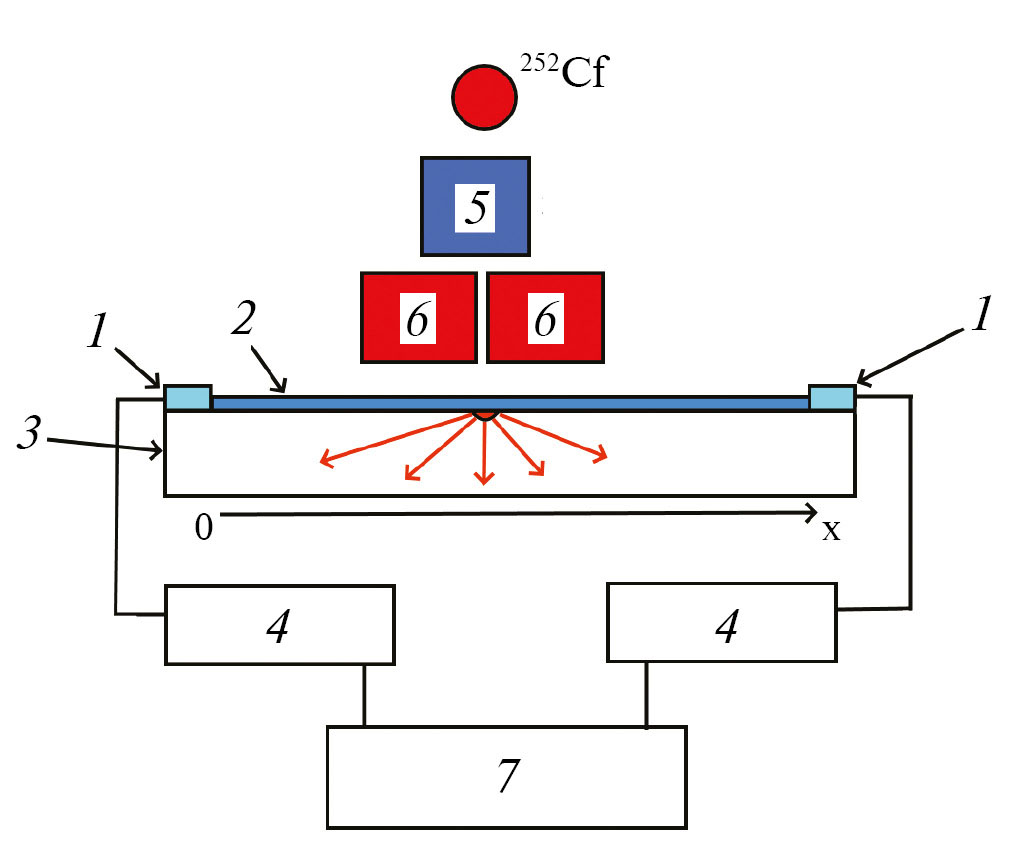 Для тестирования детектора была собрана схема, изображенная на рис. 3. В качестве источника нейтронов использовали 252Cf, после которого расположен замедлитель нейтронов толщиной 100 мм, заполненный тяжелой водой D2O. Детектор расположен на линейном трансляторе Zaber LHM100A-T3A с ходом 100 мм, которая перемещает детектор вдоль пучка. После замедлителя распложена комбинированная защита толщиной 5 см, состоящая из слоев кадмия и свинца со щелью размером 2 × 20 мм. Общая толщина кадмия около 2 см, свинца — 3 см. Расстояние источник нейтронов–детектор 30 см. Детектор расположен на расстоянии около 3 мм от щели. Дополнительно для защиты от рассеянного излучения детектор с системой перемещения закрыты со всех сторон свинцовыми кирпичами толщиной 30 мм, перед которыми располагали листы кадмия толщиной 2 мм. Сигналы, полученные с кремниевых фотоумножителей, попадают на предусилитель с временем интегрирования 1.5 мкс, сигналы с которого анализируются и сохраняются аналогово-цифровым преобразователем Caen DT5720.