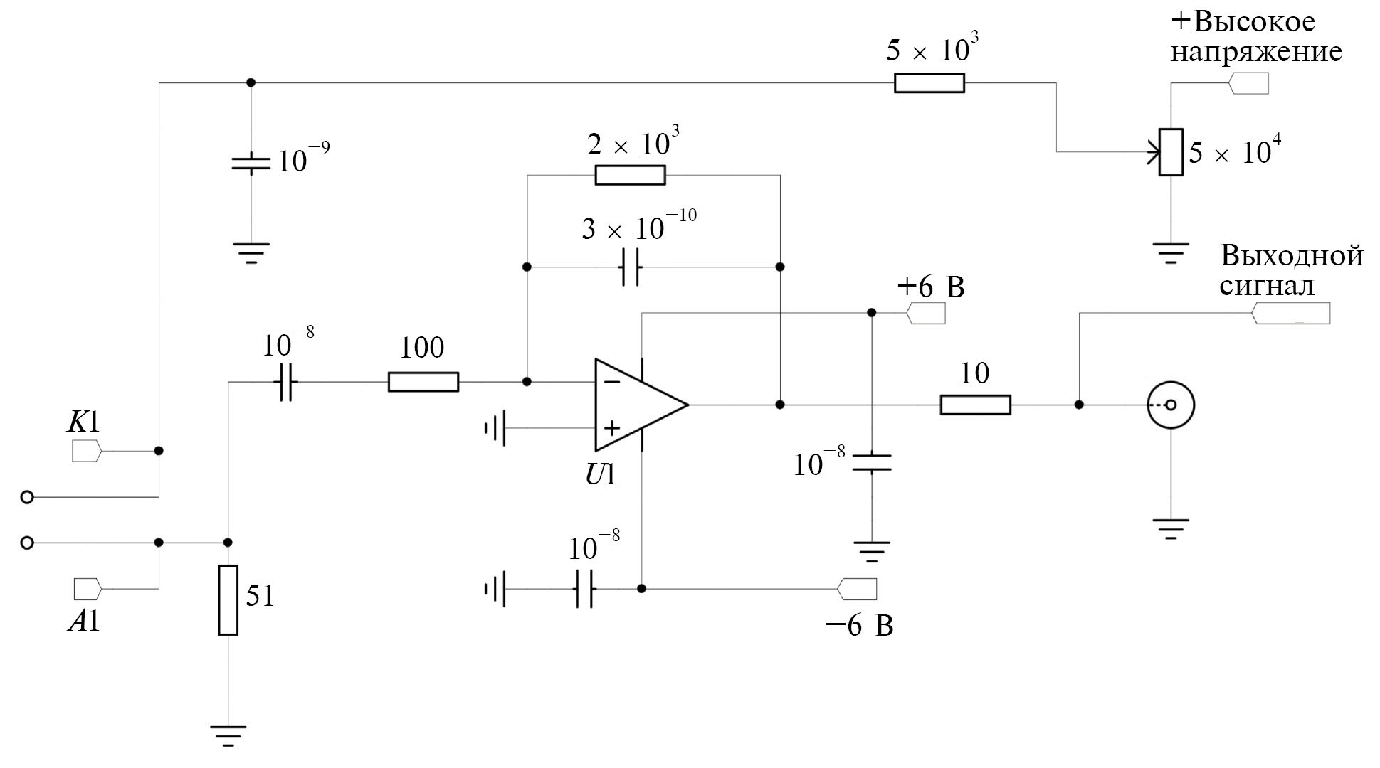 Рис. 5. Схема цепи предусилителя. Цифрами у каждого элемента даны сопротивление в Ом или емкость в Ф (для резисторов и конденсаторов соответственно).