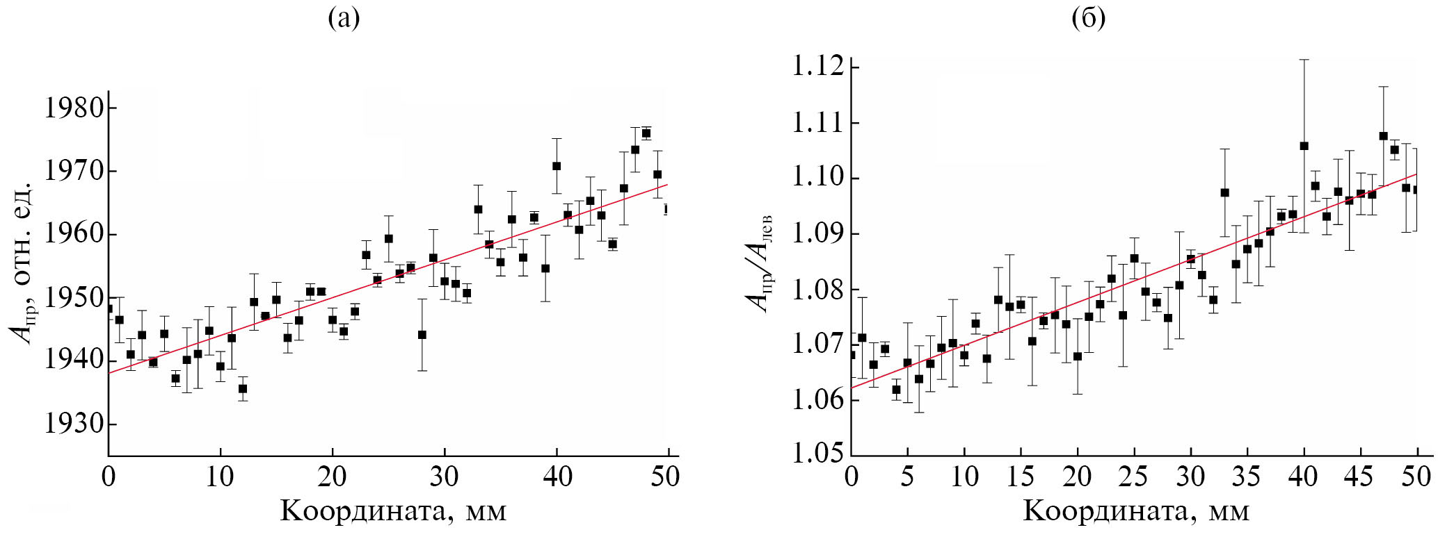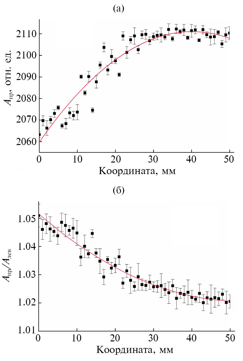 Рис. 7. Результаты измерений с помощью детектора без диффузионного отражателя: а — средняя амплитуда сигнала от правого кремниевого фотоумножителя; б — отношение амплитуды сигнала, полученного от правого кремниевого фотоумножителя Aпр, к сигналу от левого Aлев: точки — экспериментальные данные, линия — аппроксимация.