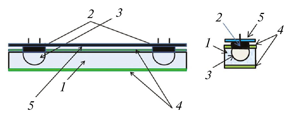 Рис. 1. Конструкция сцинтилляционного детектора тепловых нейтронов (вид спереди и сбоку): световод из органического стекла или полистирола (1); лавинные диоды кремниевого фотоумножителя (2); оптические линзы, имплементированные в световод (3); сцинтиллятор ZnS(Ag)/LiF (4); плата крепления кремниевых фотоумножителей (5).