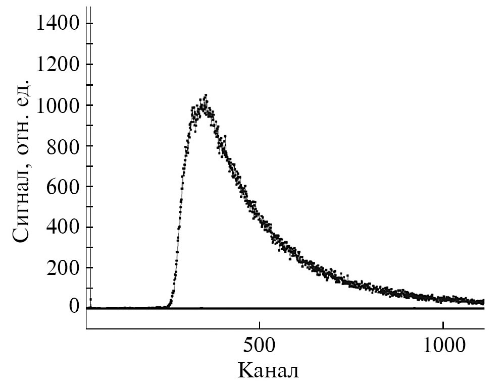Во время тестовых измерений источником нейтронов служил радиоизотоп 252Cf (НК252М11) с парафиновым замедлителем. Зарядовые спектры, полученные детектором, при облучении тепловыми нейтронами, приведены на рис. 2. Максимум спектра соответствует 95 фотоэлектронам. Калибровку проводили по темновым шумам кремниевого фотоумножителя. В качестве детектора, с которым проводили сравнение, использовали пропорциональный счетчик “Гелий-3” высокого давления (8 атм. 3Не) фирмы “Консенсус”. Из соотношения счетов гелиевого и сцинтилляционного счетчиков, с учетом их чувствительных площадей, получена относительная эффективность сцинтилляционного счетчика, равная 74%. Исходя из давления гелия-3 в счетчике-образце, указанного в паспорте прибора, эффективность сцинтилляционного счетчика можно считать равной 80% при длине волны излучения 1.8 Å. Соответственно, абсолютную эффективность сцинтилляционного счетчика можно оценить, как 60% [6].