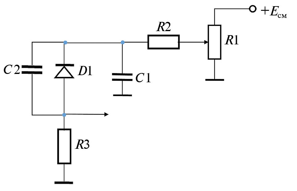 Рис. 3. Стандартная схема смещения детектора: R1 — регулятор смещения; C1 –накопительный конденсатор; R2 — баластный резистор; R3 — нагрузочное сопротивление кремниевого фотоумножителя; C2 — распределенная емкость кремниевого фотоумножителя (1 нФ); D1 — кремниевый фотоумножитель.