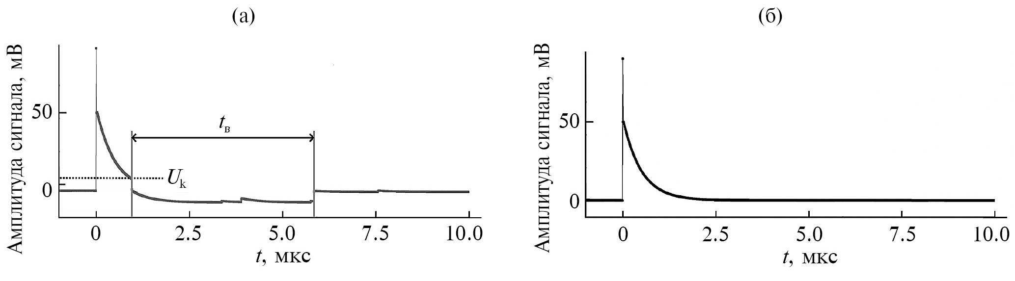 Рис. 4. Результат моделирования формы сигнала на стандартном кремниевом фотоумножителе (а) и на выходе цепи с динамическим смещением (б) [18]. Uк — напряжение срабатывания компаратора, tв — время перекомпенсации.