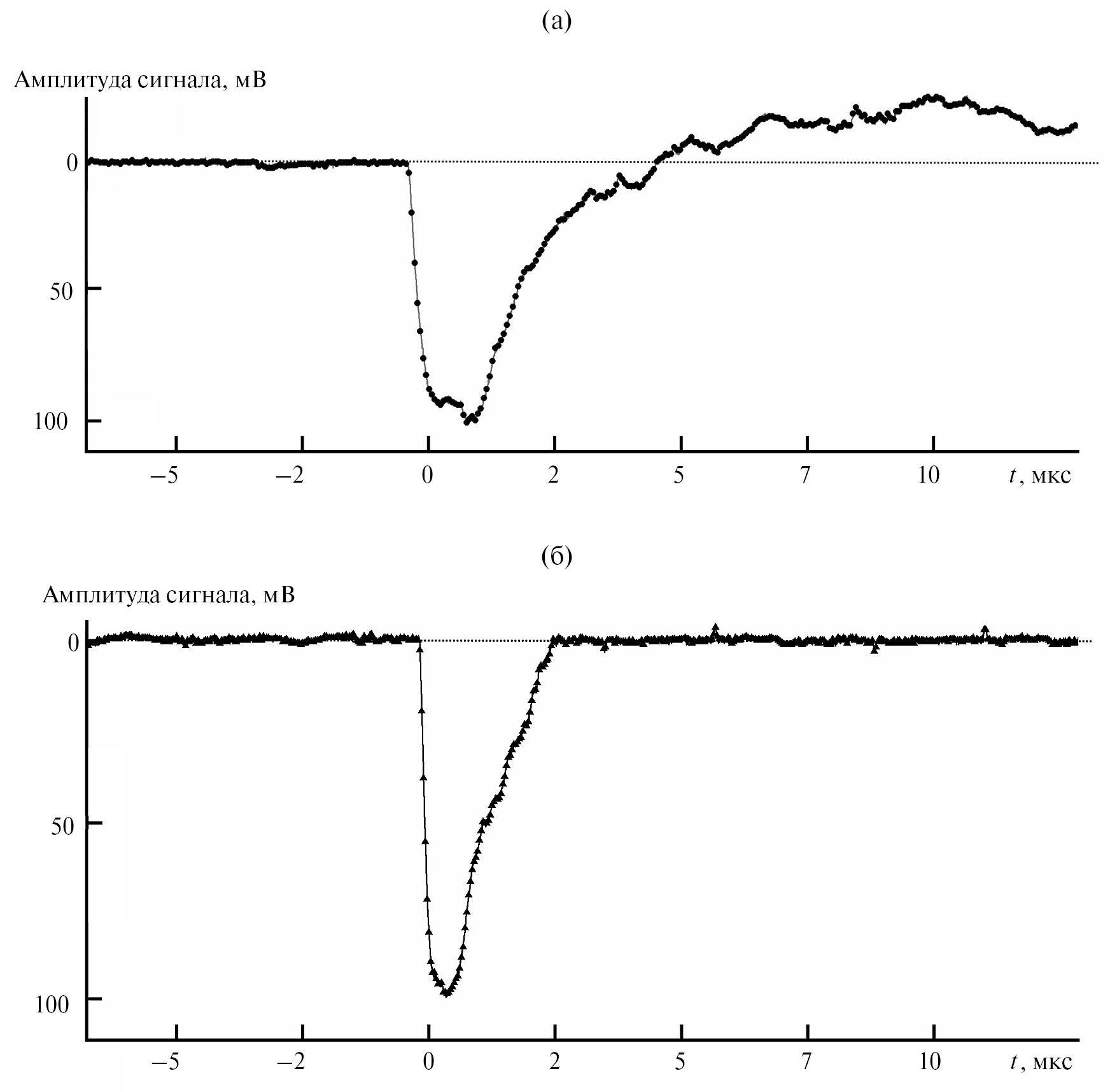 Рис. 6. Сигналы, полученные от детекторов со стандартной (а) и динамической (б) схемами смещения кремниевых фотоумножителей.