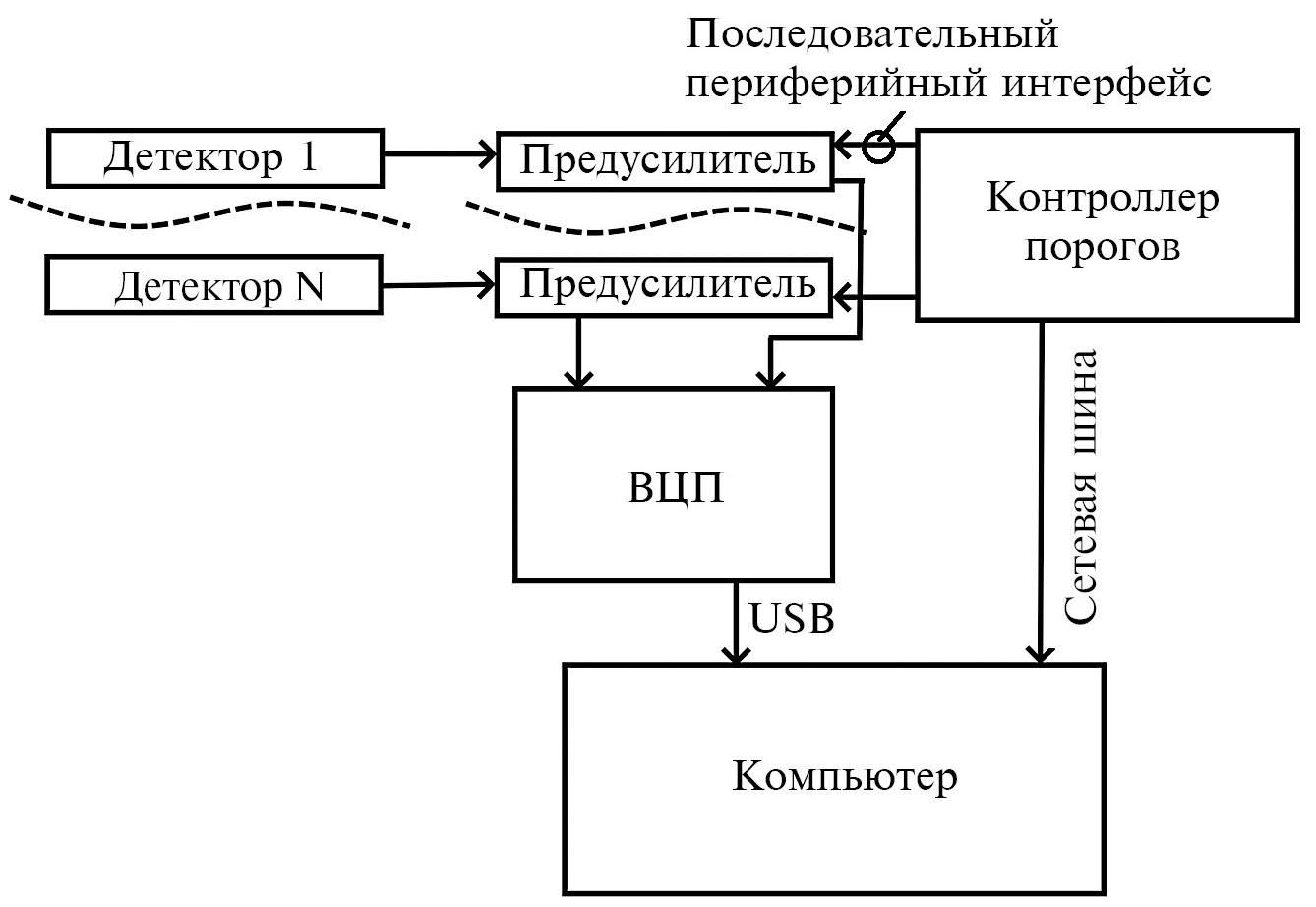 Для времяпролетного дифрактометра “СФЕРА”, который создают в ИЯИ РАН, была разработана новая система регистрации для работы на импульсном источнике “РАДЭКС”. Блок-схема системы регистрации представлена на рис. 7. Каждый детектор имеет независимый предусилитель, который связан с контроллером порогов с помощью последовательного периферийного интерфейса (Serial Peripheral Interface, SPI) и управляется командами по сетевой шине контроллера (CANBUS). Контроллер порогов основан на микроконтроллере ATMEGA2560 со специальным программным обеспечением (ПО) [19]. Сигнальные выходы от детекторов поступают на многоканальный время-цифровой преобразователь (ВЦП), который основан на программируемой логической интегральной схеме (ПЛИС) Xilinx XC7K325 и имеет 80 независимых каналов [20]. Алгоритм считывания информации следующий. Программируют пороги, величину кванта времени, задержку сигнала “строб” в ВЦП. Система готова к работе. Сигнал “строб” обозначает старт начала измерения нейтронного времяпролетного спектра. После прихода сигнала “строб” от ускорителя или прерывателя нейтронного пучка запускается многоканальный ВЦП на измерение времени пролета, т.е. интервалов между сигналом “строб” и сигналами “стоп” от счетчиков. Полученные данные поступают на компьютер через интерфейс USB.