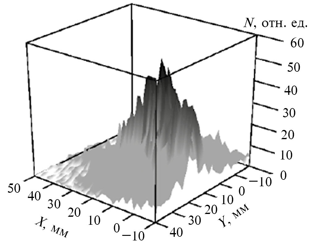 Рис. 3. Измеренное детектором 100 × 100 мм распределение потока нейтронов N на расстоянии 3 м от бериллиевой мишени из канала фотонейтронного источника.
