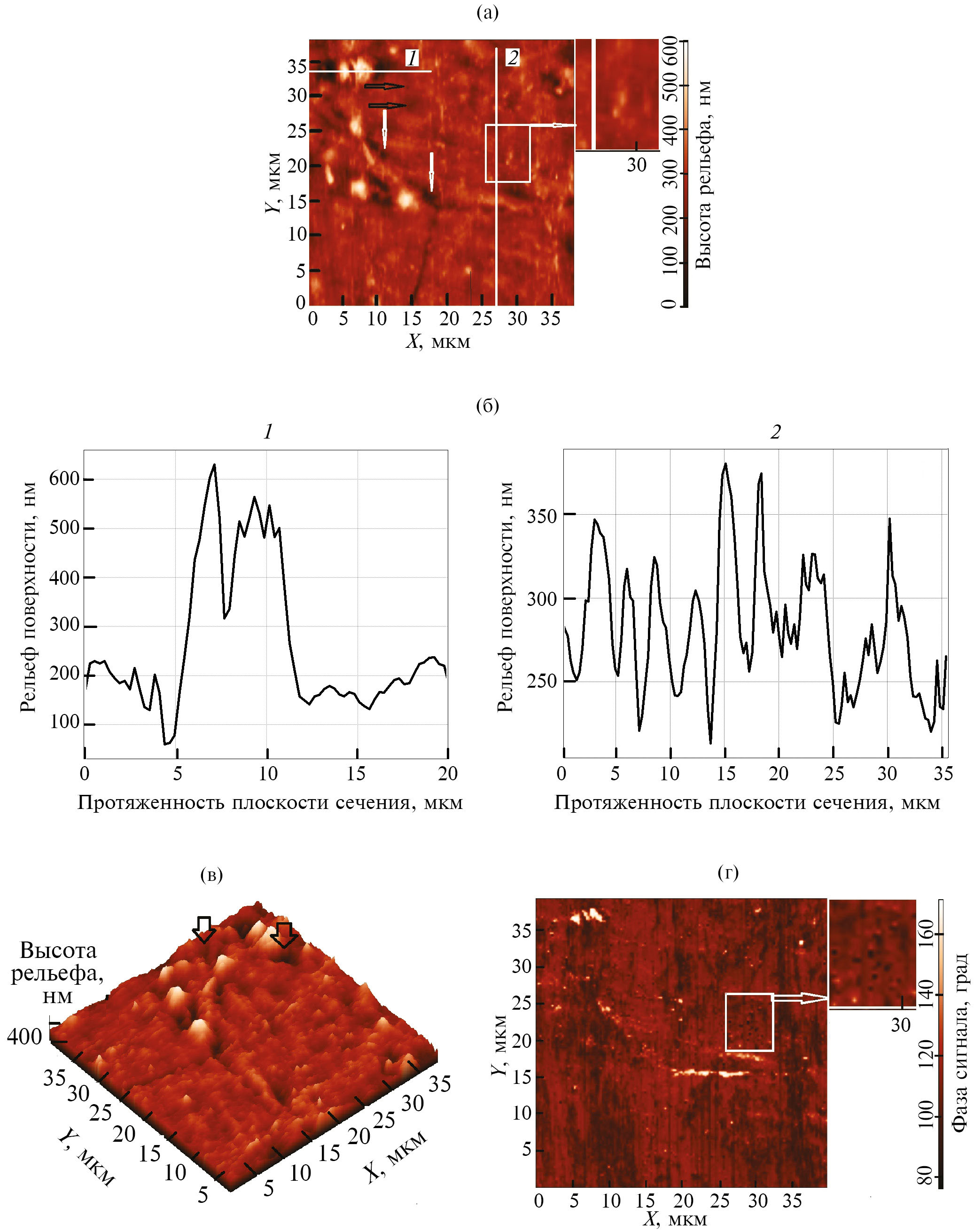 Рис. 1. Амплитудное (а), трехмерное (в) и фазовое (г) АСМ-изображения поверхности образца состава Pd95Pb5 и профили рельефа выделенных на рис. 1а участков 1 и 2 (б).