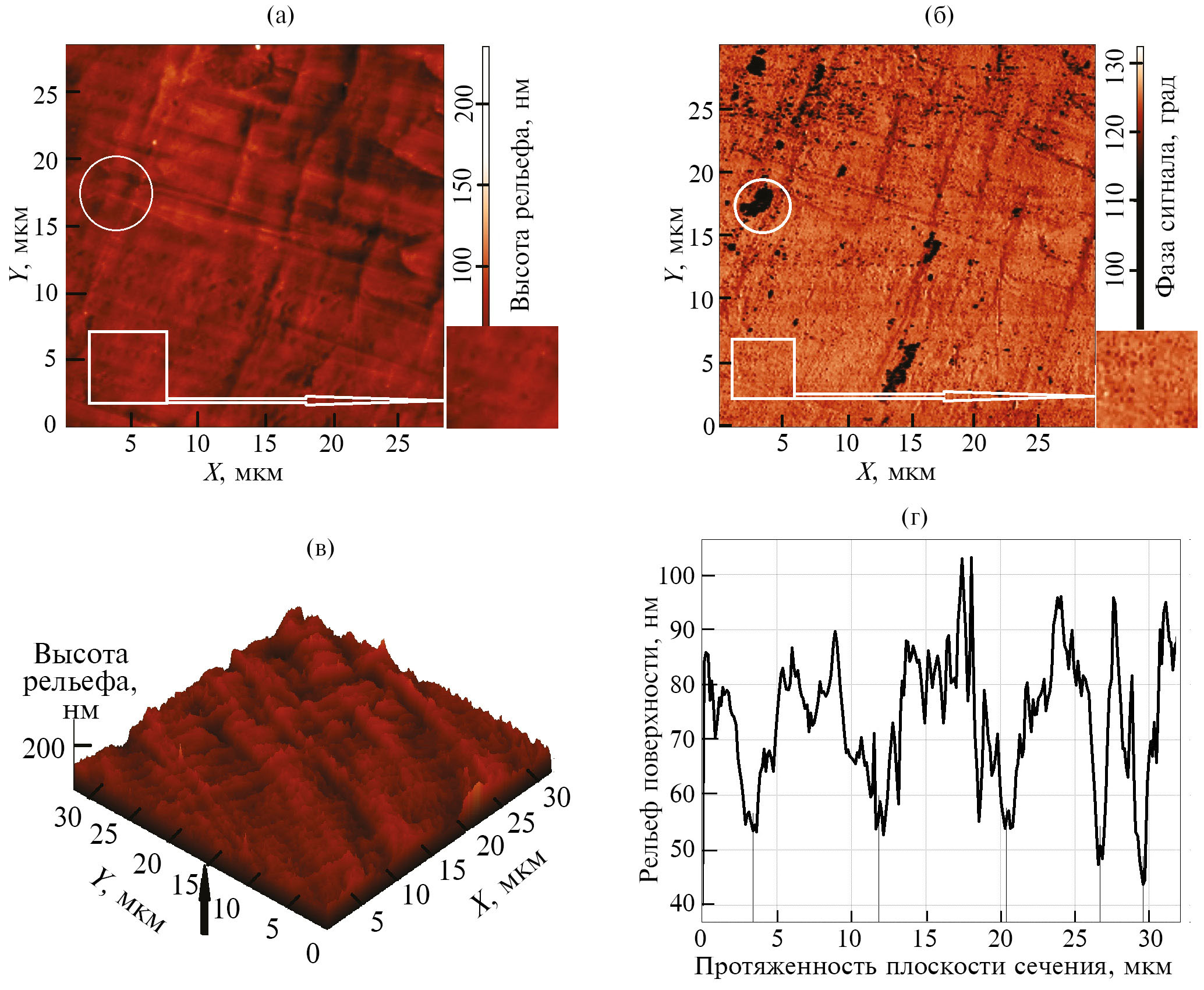На АСМ-изображении, выполненном методом латеральных сил, заметны вариации контраста, что показывает высокую чувствительность отклика сигнала по фазе к локальным вариациям твердости поверхности исследуемого образца (рис. 3б — выделено белой окружностью). Полагаем, что причиной изменения латеральной силы полагаем флуктуации элементного состава на разных участках поверхности. На рис. 3а топологическую область формирования пониженной твердости поверхности мы выделили в аналогичной окружности. По всей видимости, обнаружение подобных участков свидетельствует о наличии фазы, обедненной легирующими элементами, которые при добавлении к палладию увеличивают твердость поверхности мембран [1, 3].