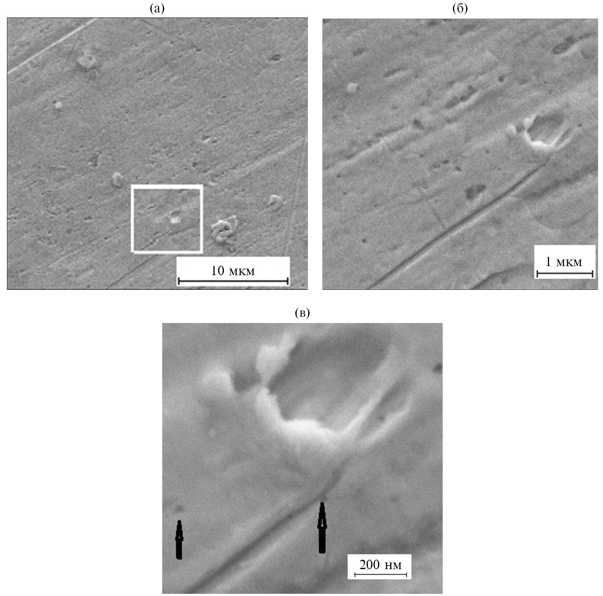 Рис. 4. РЭМ-изображения поверхности сплава Pd93.5In6.0Ru0.5, полученные в режиме детектирования вторичных электронах: а — поверхность сплава с выделенной областью деформации поверхности; б — увеличенное изображение области в 36 мкм2; в — увеличенное изображение области сдвиговой деформации материала на поверхности.