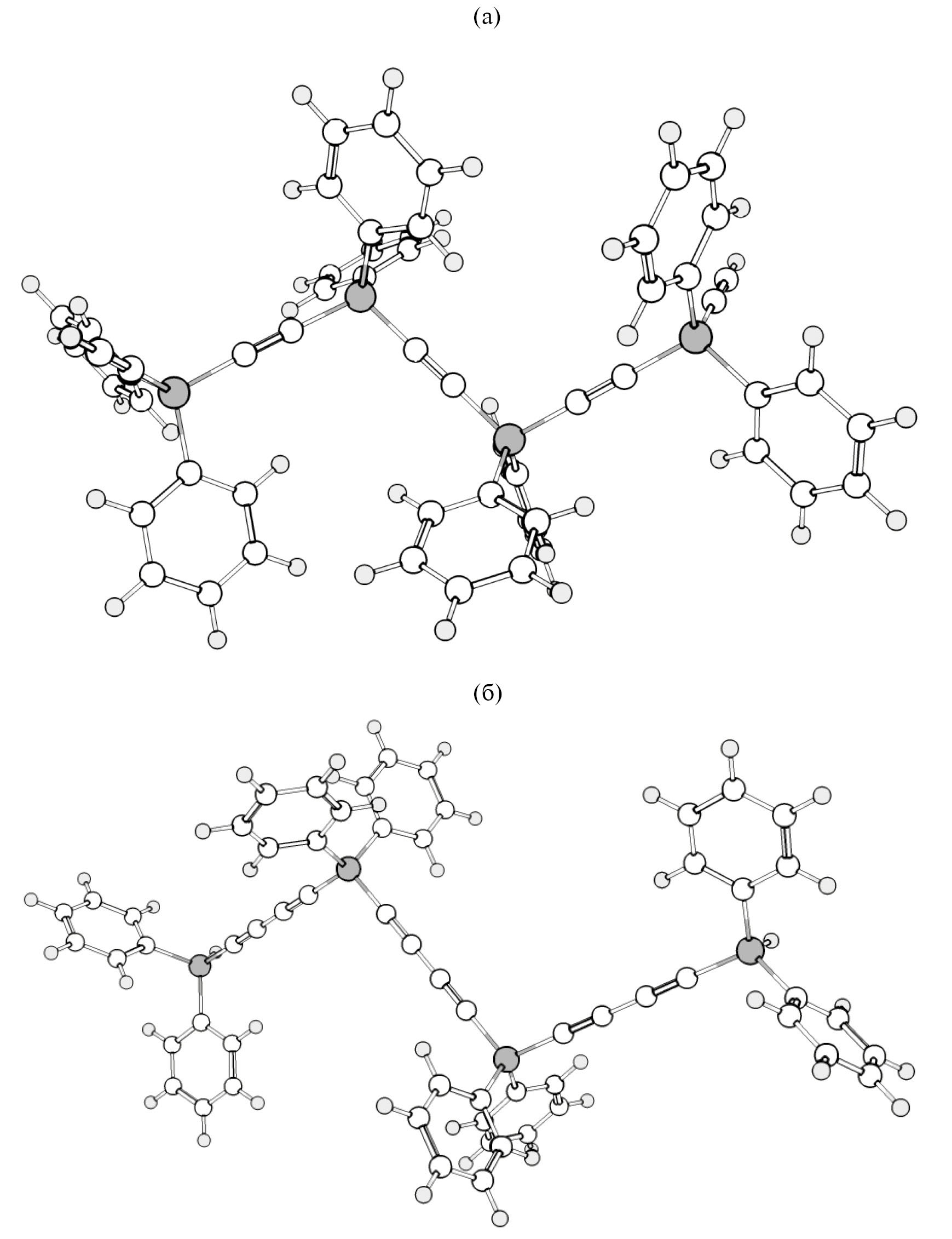 Оптимизированные структуры полимеров [–Ph2Si–(C≡C)2–]n и [–Ph2Si–(C≡C–C≡C)2–]m в газовой фазе с различными значениями n и m получены на основе квантово-химических расчетов с использованием гибридного функционала B3LYP и базиса 6-311G** для всех атомов полимера. Так как точные экспериментальные значения количества мономерных звеньев в полимере (степень полимеризации) n и m были неизвестны, расчеты проводили при значениях n и m от 1 до 6, где верхняя граница определена вычислительными возможностями компьютера. В качестве начальных координат атомов для моделирования структуры Р1 и Р2 были использованы рентгеноструктурные данные для соответствующих мономеров [17, 18] с последующим наращиванием количества звеньев.