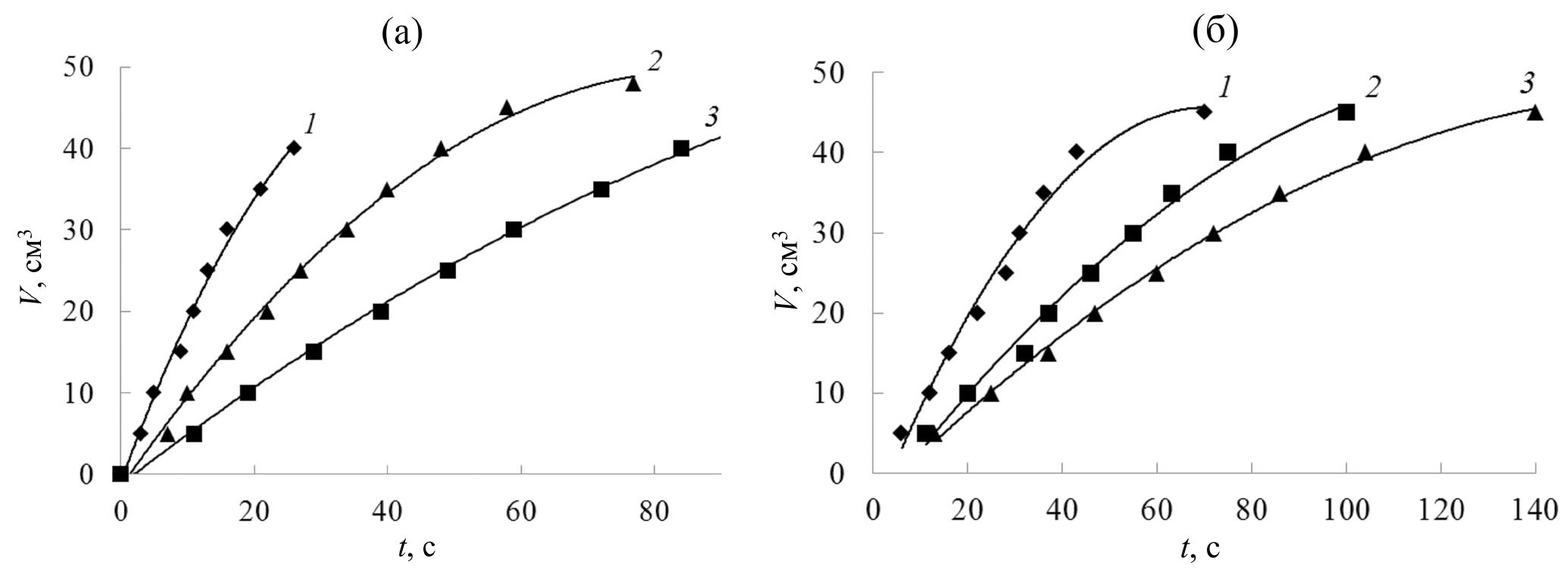 Рис. 1. Кинетика выделения водорода при гидролизе NaBH4 с катализатором: а — Co(OH)2 при 65 (1), 50 (2), 35°C (3); б — Co3O4 при 80 (1), 65 (2), 50°C (3).