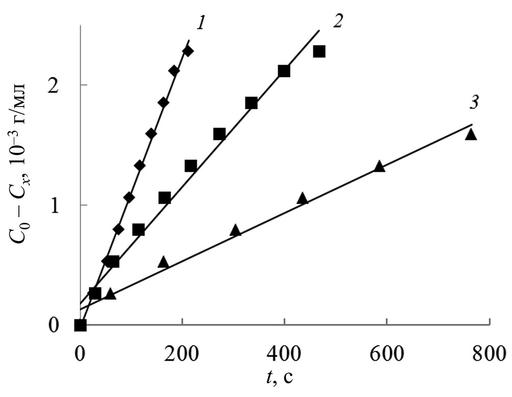Анализ экспериментальных данных проводили с использованием кинетических моделей химических реакций нулевого (3), первого порядка (4) и модели Ленгмюра–Хиншельвуда (5):