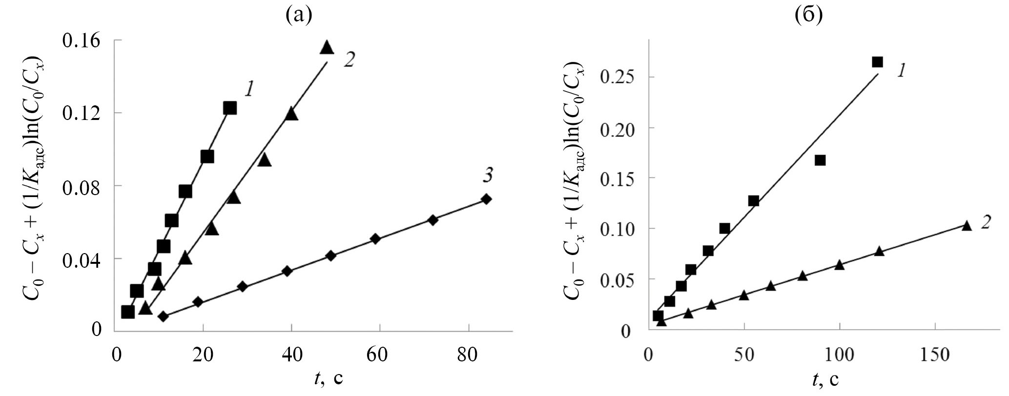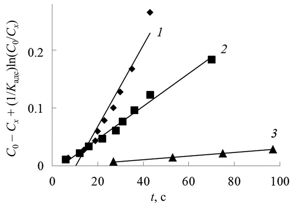 Последнюю модель можно рассматривать как комбинацию кинетических моделей нулевого и первого порядков с коэффициентом адсорбции Kадс, определяющим относительную значимость каждого члена (5), он варьируется в зависимости от температуры согласно: