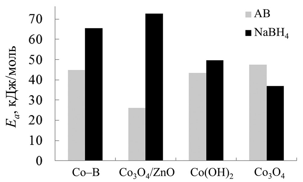 В табл. 3 приведены значения энергии активации реакции гидролиза борогидридов для изученных катализаторов в сравнении с некоторыми литературными данными. Для катализатора Co–B в зависимости от концентрации и соотношения (NaBH4/NaOH) наблюдается широкий диапазон значений 30–77.9 кДж/моль [4, 7, 10, 11, 18, 21, 34]. Полученное значение 65.5 кДж/моль попадает в верхнюю часть этого диапазона. Следует отметить, что в отличие от [21, 34] полученная в работе для этого катализатора энергия активации гидролиза борогидрида натрия выше, чем амминборана. Для катализаторов кобальта на подложках полученное значение 56.4 кДж/моль также близко к диапазону 15–55 кДж/моль. Для катализаторов с оксидом кобальта на подложке энергия активация выше, а без подложки — ниже данных [4]. Как сказано выше, для катализаторов на подложке цеолита приведены оценочные значения. Вычисленные значения энергии активации реакций гидролиза борогидрида натрия и амминборана [37] при использовании изученных катализаторов для сравнения приведены на рис. 5. Видно, что практически во всех случаях, кроме катализатора Co3O4, энергия активации гидролиза борогидрида натрия выше, чем амминборана.