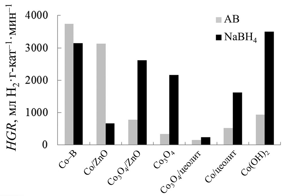 В [37] изучена кинетика реакции выделения водорода при гидролизе водных растворов амминборана с использованием кобальтовых катализаторов: металлического кобальта и оксида кобальта Co3O4 на подложках цеолита и оксида цинка, а также Co(OH)2 и смешанных катализаторов с активной частью боридов кобальта переменного состава (Co–B). Целью настоящей работы было изучение поведения этих катализаторов при гидролизе водных растворов борогидрида натрия и сравнение полученных данных о кинетике, энергии активации реакции, скорости выделения водорода с аналогичными данными об амминборане.