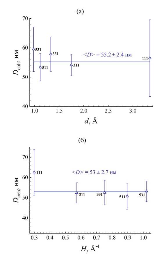 Рис. 3. Размеры ОКР кластеров фазы D03 в сплаве Fe74Al26, полученные по формулам Шеррера (3) из ширин нескольких первых сверхструктурных пиков в дифрактограммах, представленных в шкалах d (a) и H (b). Ошибки точек — статистические, горизонтальные линии соответствуют среднему размеру ОКР, полученному с использованием МНК.