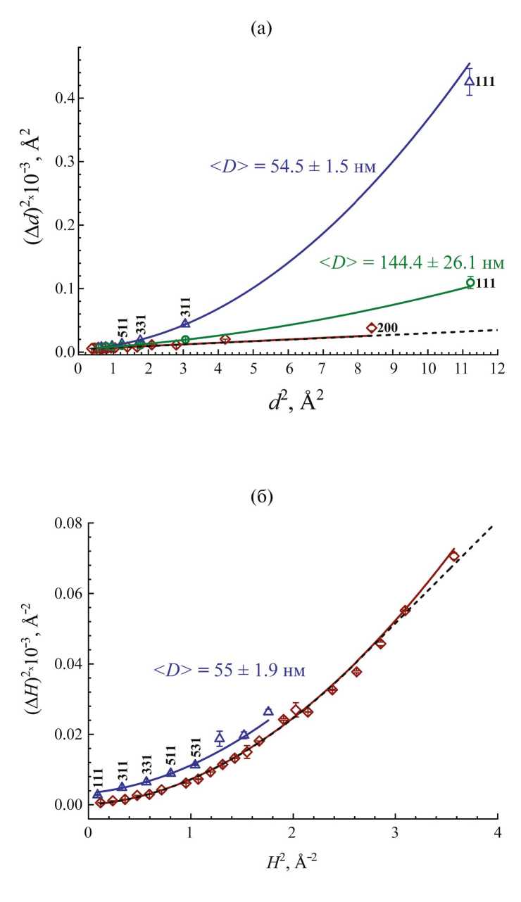 где C1 и C2 есть константы дифрактометра, С3 = (2ε)2, C4 = (1/Dcoh)2. Видно, что при отсутствии эффекта размера (C4 ≈ 0) в d-шкале зависимость (∆d)2 от d2 будет линейной, а при его наличии — параболической. В H-шкале отсутствие эффекта размера должно приводить к прохождению зависимости (∆H)2 от H2 через начало координат. Строя эти зависимости в достаточно большом интервале d или H, можно определить ε и Dcoh. Формулы (6), далее они будут обозначаться как построение Вильямсона–Холла, позволяют не только получить оценки величин Dcoh и ε, но и выявить наличие (или отсутствие) анизотропии ширин пиков, т.е. их зависимость от конкретного набора индексов Миллера.