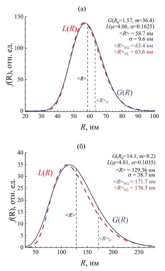Согласно [16] логнормальное распределение кристаллитов по размерам является более естественным, чем гамма-распределение. Кроме того, расчеты гамма-распределения бывают затруднены из-за необходимости возводить большие числа в большую степень (фактор xm в формуле (7)). Поскольку при малой асимметрии оба распределения близки друг другу по форме, то для визуального представления расчетов можно использовать логнормальное распределение:
