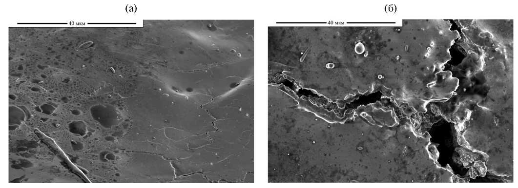 Поверхность облученных образцов исследовали с помощью растрового электронного микроскопа (РЭМ) VERSA (FEI, USA). Изображения получали в режимах регистрации вторичных и обратно рассеянных электронов при различном увеличении. Было продемонстрировано, что уже после трехкратного воздействия на поверхность вольфрамового образца, кроме зон с характерными размерами от ≈1 до ~10 мкм, в которых происходило плавление, существуют отдельные трещины длиной до ≈10 мкм, шириной ≈0.2 мкм (рис. 2а) а при десятикратном воздействии ширина трещин достигает ≈4 мкм (рис. 2б). На рис. 2а видно, что после трехкратного воздействия формируется сеть трещин общей протяженностью более 100 мкм.