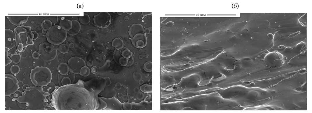 Рис. 3. Изображения поверхности мишеней из стали после 6 (а) и 10 (б) воздействий пучка электронов.