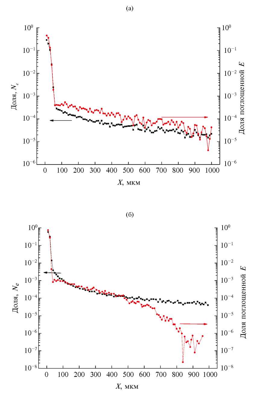 Были рассчитаны зависимости процентного соотношения поглощенной образцом энергии в зависимости от энергии всего пучка, а также процентного соотношения количества электронов, энергия которых опустилась ниже порога (0.01 МэВ) прослеживания (т.е. фактически поглощенных материалом мишени электронов), в зависимости от глубины прохождения электронов внутри мишени. На рис. 4 представлены графики указанных зависимостей для мишеней, изготовленных из стали (рис. 4а) и вольфрама (рис. 4б).