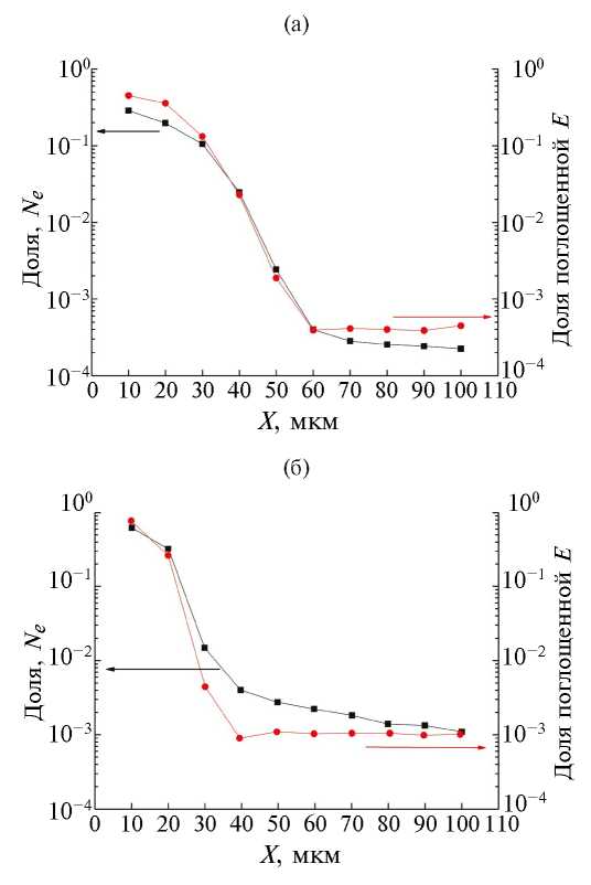 Рис. 5. Доля электронов Ne, энергия которых опустилась ниже порога прослеживания после взаимодействия с мишенью, и доля поглощенной мишенью энергии пучка E в зависимости от расстояния до облучаемой поверхности мишени X в приповерхностном слое толщиной 100 мкм образцов из стали (а) и вольфрама (б).