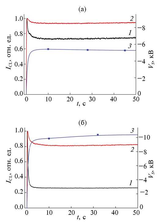 Рис. 1. Зависимость интенсивности сигнала катодолюминесценции ICL кварцевого стекла (1), стекла, покрытого золотой пленкой (2), и потенциала зарядки VS кварца (3) от времени облучения электронами с энергией E0 = 10 (а) и 15 кэВ (б), плотностью тока j0 = 10–5 А/см2.