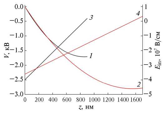 Рис. 3. Рассчитанные зависимости потенциала V (1, 2) и напряженности электрического поля Ein (3, 4) в кварцевом стекле от глубины z при E0 = 10 (1, 3) и 15 кэВ (2, 4).