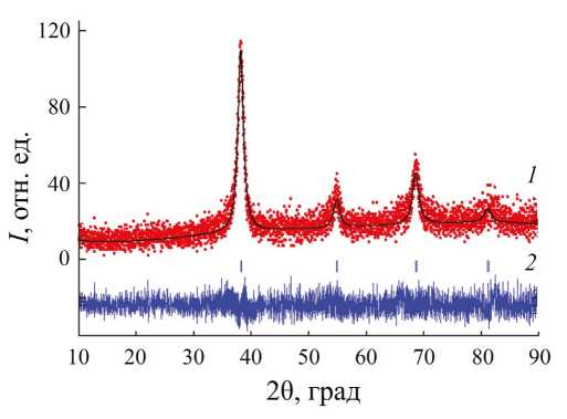 Рис. 6. Дифрактограмма образца гидридной фазы на основе TiZrNbMoTa после десорбции водорода при температуре 973 К, обработанная методом Ритвельда. Показаны экспериментальный (точки) и расчетный профили (сплошная линия) (1); разность между ними (2); штрихи соответствуют брэгговским позициям.