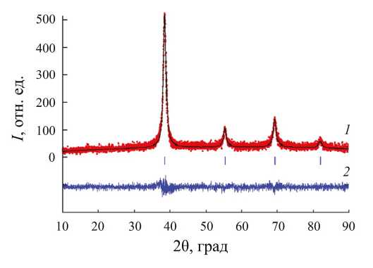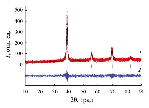 Рис. 4. Дифрактограмма образца гидридной фазы на основе TiZrNbMoTa после десорбции водорода при температуре 673 К, обработанная методом Ритвельда: экспериментальный (точки) и расчетный профили (сплошная линия) (1); разность между ними (2); штрихи соответствуют брэгговским позициям.