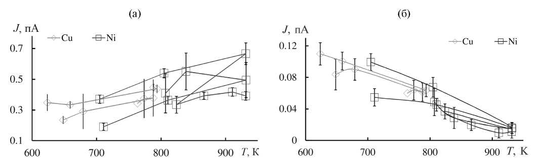 3. Fig. 2. Primary processing data for Ni and Cu substrates: average values ​​of ion currents J(Te+) (a) and J(Te2+) (b) depending on sample temperature T.