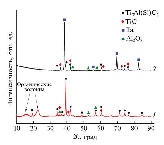Рис. 1. Дифрактограммы прекерамической бумаги (1) и поперечного сечения спеченного ламинированного композита Ta/TAC–TiC (2).