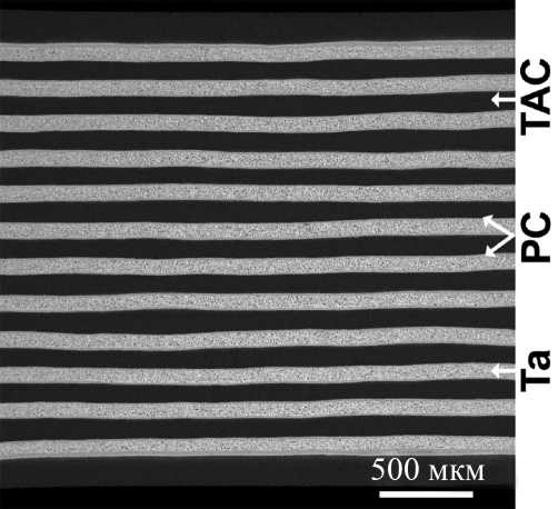 В качестве исходных материалов для получения ламинированных композитов использовали прекерамическую бумагу на основе MAX-фазы Ti3Al(Si)C2 (TAC) толщиной ~300 мкм и металлические фольги Ta толщиной ~100 мкм. Прекерамическая бумага была произведена с использованием бумагодельной машины D7 Sumet Systems GmbH (Денклинген, Германия). Состав листов бумаги: 87 мас. % порошка Ti3Al0.75Si0.25C2, 7.3 мас. % целлюлозных волокон, 3 мас. % порошка Al2O3 и 2.7 мас. % добавок для удержания. Из исходного сырья были подготовлены “стеки” с укладкой прекерамических бумаг и фольг тантала один через один слой с общим количеством слоев 25 (внешними слоями были слои TAC). Образцы ламинированных композитов получали методом искрового плазменного спекания на установке SPS 10-4 (GT Advanced Technologies, USA) при температуре 1250°C в условиях вакуума (0.1 Па), приложенном давлении прессования 50 МПа и времени изотермического выдерживания 5 мин.