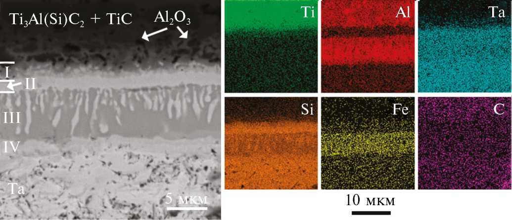 Анализ состава реакционного слоя методом энергодисперсионной спектроскопии (рис. 3, табл. 1) показал, что он состоит преимущественно из Ta, Al, Si и небольшого количества примесного Fe. Присутствие Si в слое Ta обусловлено перекрытием их спектральных линий. Присутствие примеси железа связано с его использованием изготовителем для снижения температуры синтеза порошков MAX-фазы. На основе данных точечного анализа состава (табл. 1) предполагается, что реакционный слой имеет микроструктуру, состоящую из четырех основных слоев: I — (Ti,Ta)5Si3Сх; II — (Ta,Ti)5Si3Сх; III — Ta(Al,Fe)2 (темный контраст) + Ta5Si3 (светлый контраст); IV — Ta2Al + Ta2C.