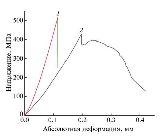 Рис. 4. Деформационные кривые монолитного образца TAC (1) и ламинированного композита Ta/TAC–TiC (2).