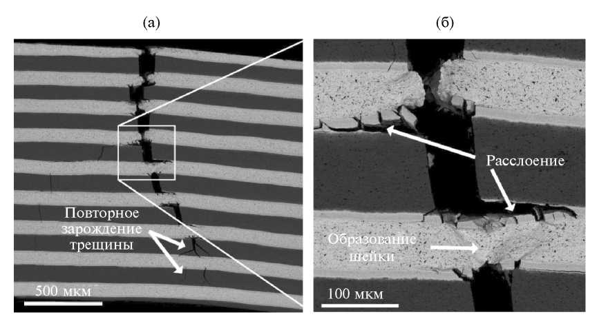 Рис. 5. РЭМ-изображения поперечного сечения поверхности разрушения (а) и области распространения трещины в ламинированном композите Ta/TAC–TiC (б).