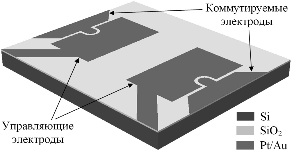Миграция адгезионного материала была обнаружена в ходе испытаний МЭМС-переключателя, оснащенного механизмом активного размыкания [9]. Образец содержит две пары управляющих и коммутируемых электродов, схематично изображенных на рис. 1 (подвижная балка, расположенная над электродами, на рисунке не показана). Электроды сформированы на кремниевой пластине толщиной 460 мкм с удельным сопротивлением 12 Ом · см, покрытой термически выращенным слоем SiO2 толщиной 1 мкм. Они имеют двухслойную структуру: слой платины или золота толщиной 100 нм нанесен методом магнетронного распыления в среде аргона на адгезионный слой хрома толщиной 10 нм. Расстояние между управляющим и коммутируемым электродами составляет 2 мкм. Подробное описание образцов представлено в [10].