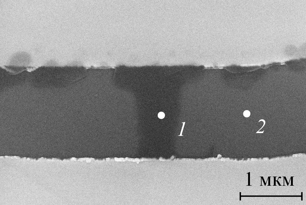 По мере подачи импульсов размер структур увеличивался. Некоторые из них перекрывали зазор между электродами (рис. 3). Структура имеет форму полосы шириной около 500 нм и высотой 100 нм. В табл. 1 представлены результаты определения химического состава полосы (область 1) и соседней поверхности SiO2 (область 2). Оба участка содержат небольшое количество углерода, обусловленное контаминацией, но на структуре процент C примерно вдвое выше. В области 1 регистрируется хром, отсутствующий на свободной поверхности SiO2, а также пониженное содержание кислорода и кремния по сравнению с подложкой. Видимо, материал структуры частично экранирует SiO2 от бомбардирующих электронов и ослабляет рентгеновское излучение, идущее из этого слоя. Платина практически не детектируется в обеих областях. Эти данные позволяют предположить, что материалом структур является хром в комбинации с углеродом. Единственным источником Cr служит адгезионный слой электродов.