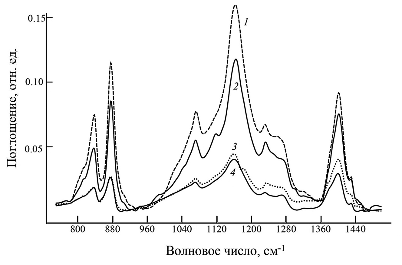 Рис. 1. ИК-фурье-спектры образцов Ф-42, кристаллизованных при 60°С из раствора: ДМСО/Ф-42 (1); ДМФ/Ф-42 (2); ДМФ/Ф-42–нанографит (3); ДМСО/Ф-42–нанографит (4).