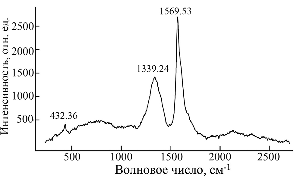 Рис. 4. Спектр КРС нижней стороны образца пленки, кристаллизованной из 5 мас. % Ф-42, наполненного 5 мас. % нанографита, при 60°С в течение 72 ч из раствора ДМСО. В спектре наблюдаются два пика D (полоса около 1340 см–1) и G-полоса около 1570 см–1.