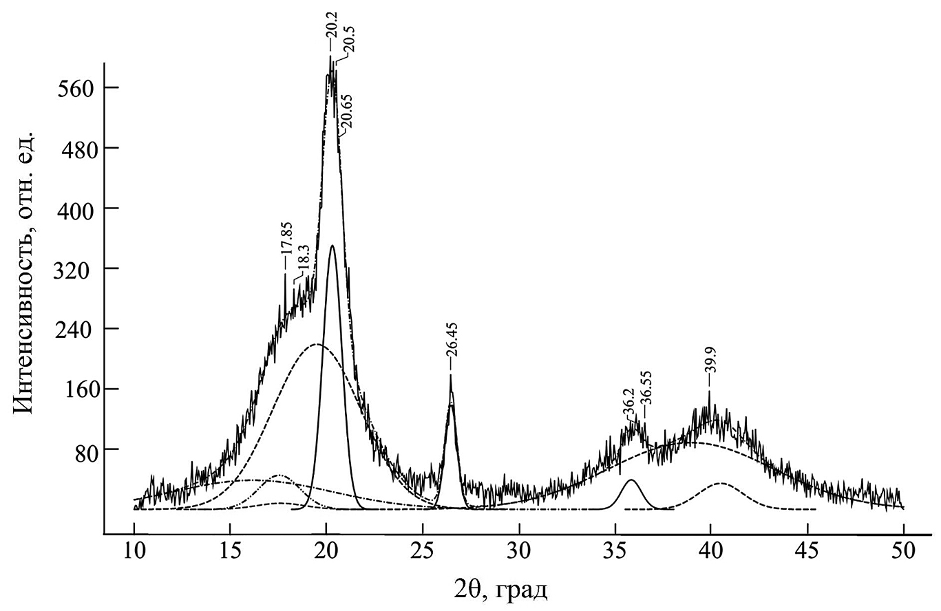 Метод рентгеновской дифракции позволяет фиксировать изменение ориентации осей элементарной ячейки и позволяет установить содержание и состав как кристаллической, так и аморфной фазы полимера. При совместном присутствии α- и β- фаз в образце ПВДФ на дифрактограмме будет наблюдаться интенсивный сложный пик в области 2θ ≈ 20.00°. β-фаза проявляется в виде плеча пика при более высоких значениях 2θ, а также дополнительного пика при 2θ = 36.30°. Как правило, возникают сложности с идентификацией γ-фазы, особенно при ее совместном содержании с α-фазой. Положение γ-фазы представляет собой суперпозицию пиков 020 и 002 при 2θ = 18.5° и 19.2° соответственно, и более интенсивный пик 100 может быть обнаружен при 2θ = 20.04°. Подобно α-фазе, γ-фазе соответствует более слабый пик 022 в области 2θ = 26.8°. Таким образом, часть пиков γ-фазы совпадает или близка с α-фазой, а часть — с β-фазой. Все фазы проявляют интенсивный пик около 20°, но только α- и γ-фазы показывают другие пики, близкие к 18°, что относительно легко отличает их от β-фазы. На дифрактограммах исходного порошка Ф-42 присутствуют основной дифракционный пик при 20.45° и рефлексы при 35.74° и 41.01°, соответствующие β-фазе в ПВДФ, которые приписывают отражениям от плоскостей (200), (020), (310), (111), (201) ромбической фазы. В то же время положение дифракционного пика при 2θ = 18.4° близко к отражениям 020 и 100 α-фазы.