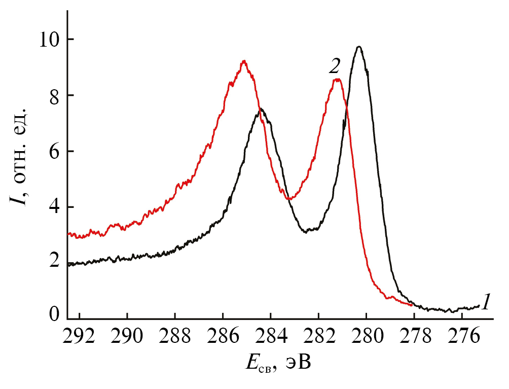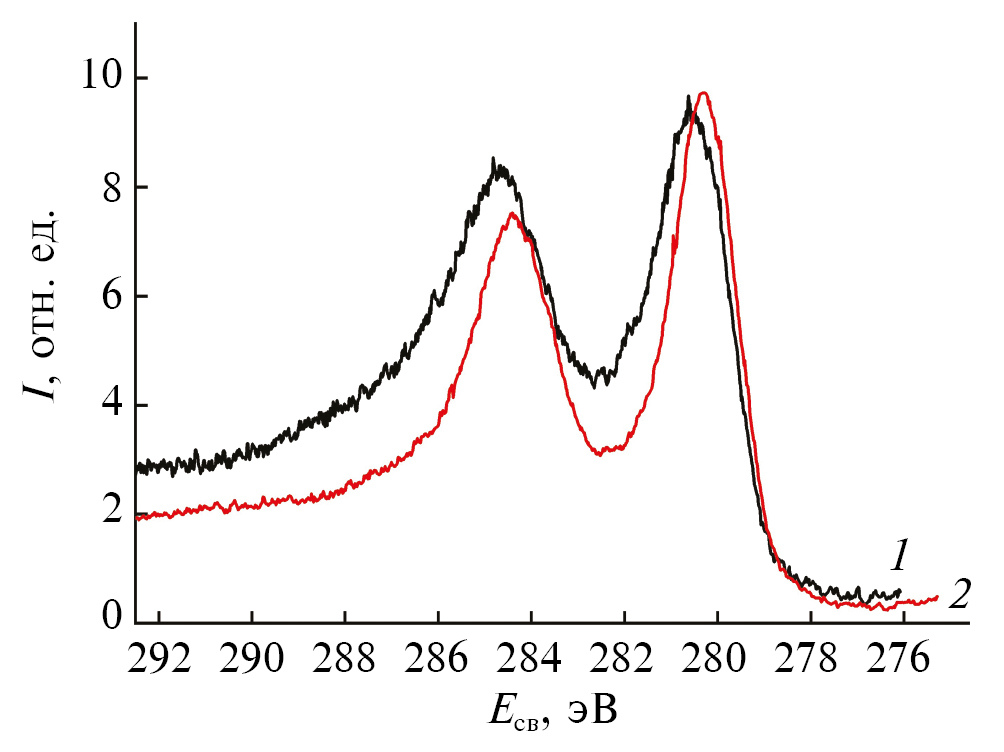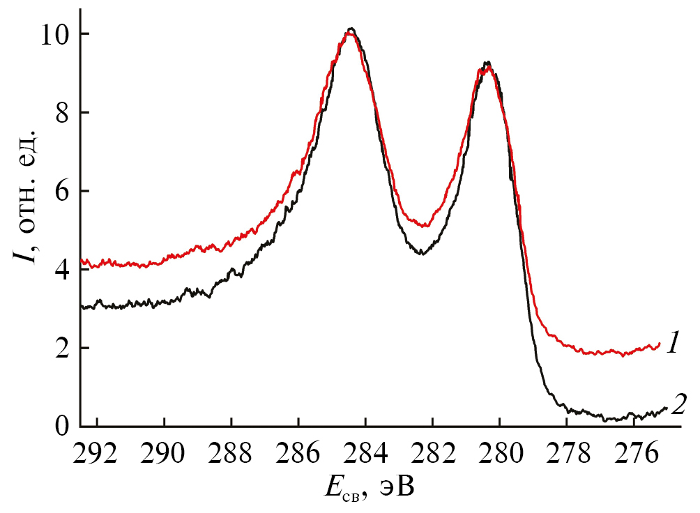 Рис. 1. РФЭ-спектры уровней Ru3d поверхности исходной пленки с естественным оксидным слоем рутения (1) и после очистки ее с помощью бомбардировки ионным пучком аргона (2).