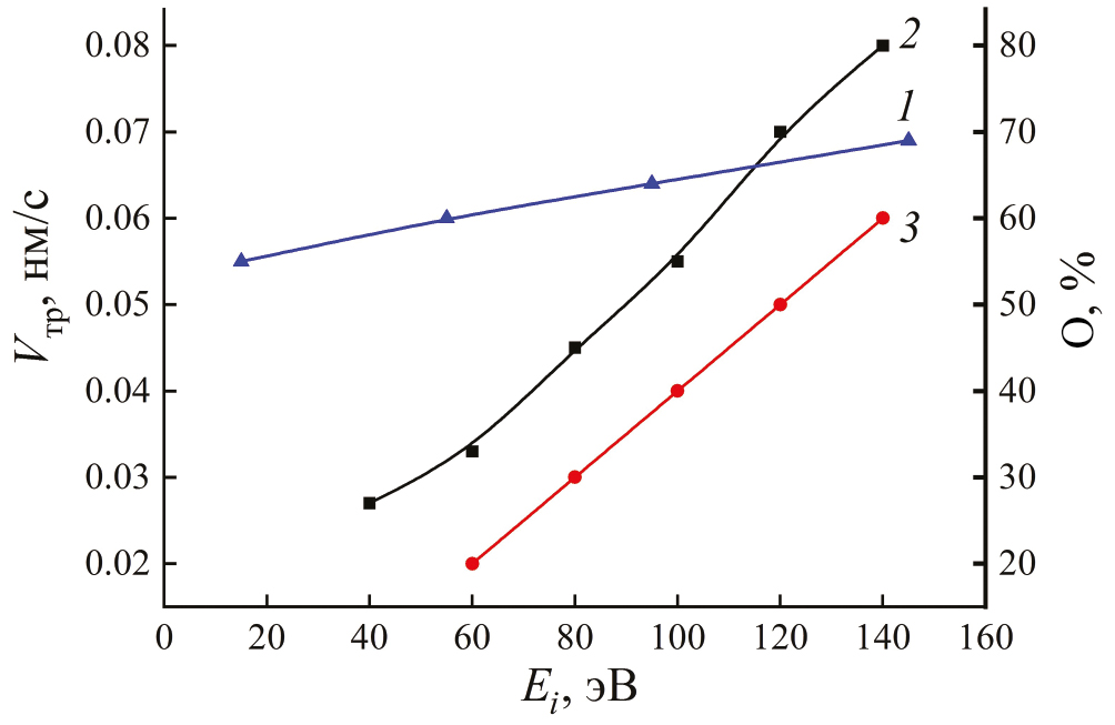 Рис. 5. Зависимость содержания кислорода в пленке (1) и скорости травления Ru в плазме O2 + 5% Ar (2) и O2 + 5% Kr (3) от энергии бомбардирующих ионов.