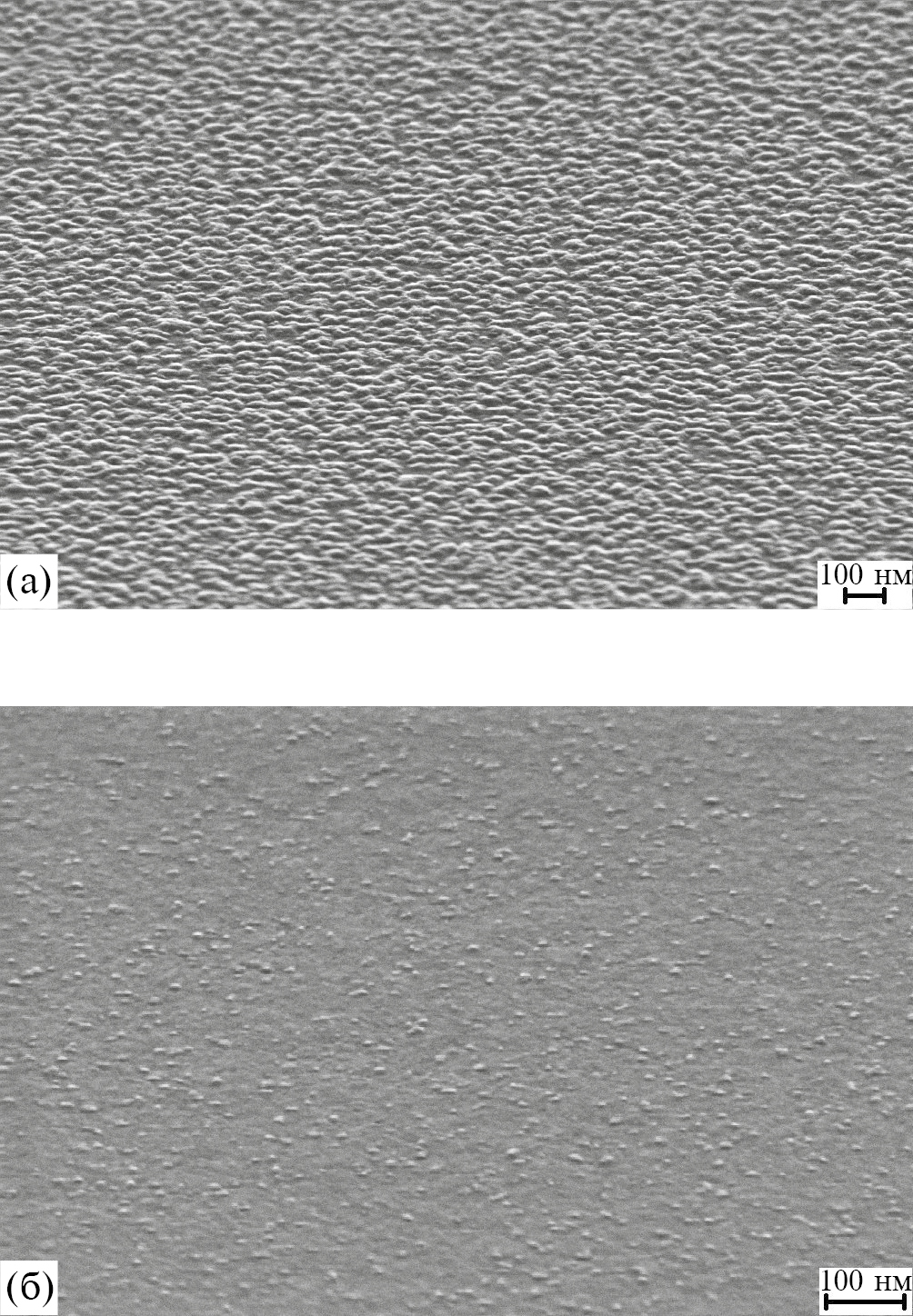 Рис. 6. РЭМ-изображение поверхности пленки Ru после травления в плазме О2 + 5% Kr при Uсм = 130 эВ в течение 240 с (а) и 30 эВ в течение 360 с (б).