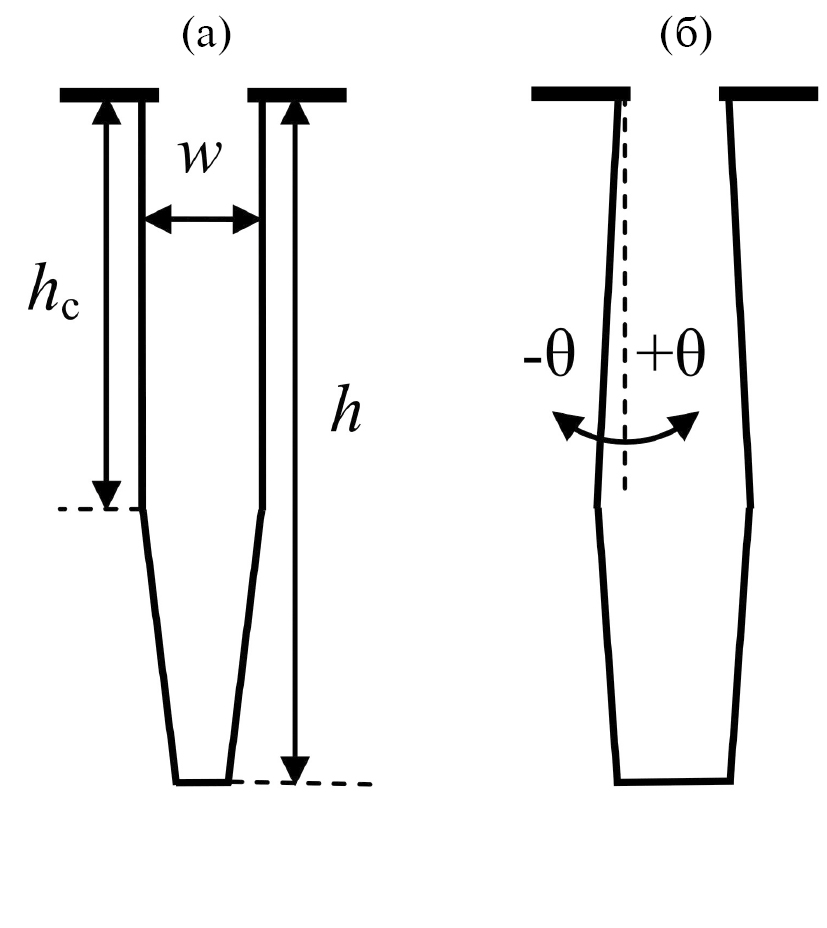 Рис. 1. Схематическое изображение профиля травления разной формы: (а) – вертикальный до критического значения аспектного отношения ARc = hc / w, (б) – бочкообразный. θ – угол наклона стенок относительно вертикали.