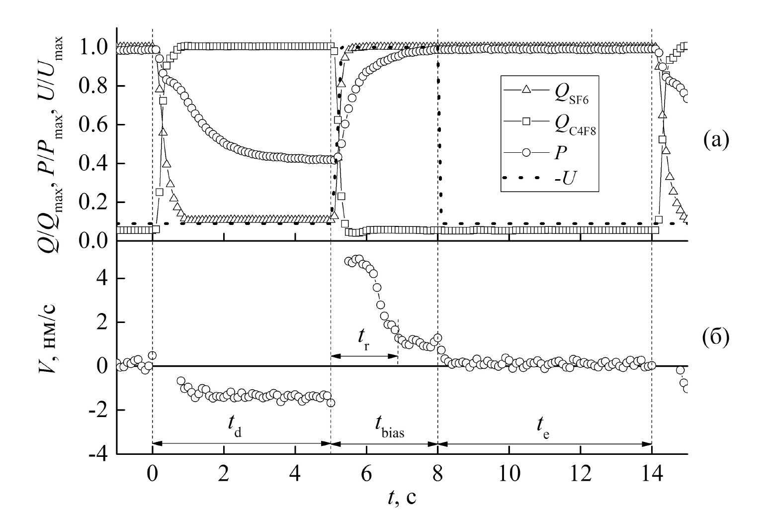 Рис. 2. (а) – Нормированные значения Q, Р, U в течение одного цикла TMDSE, (б) – скорости процессов V: осаждения (–V) и травления (+V) на разных стадиях TMDSE (R = 0.27, tr = 1.9 с).