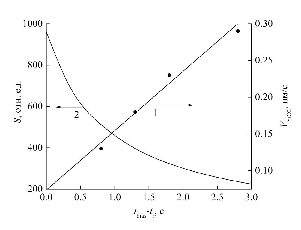 Изменение разности Δ не влияет на значение VSi при условии tbias + te = const. Следовательно, подстройка времени стадии ”удаление» tbias к измеренному значению tr, в предложенной концепции оптимизации (tbias + te = const) будет обусловливать увеличение селективности TMDSE (S) по отношению к SiO2 маске. При значении Δ = 0 с, селективность S = VSi/VSiO2 = Viso/V0 определяется соотношением скорости процессов, которые контролируются разными механизмами травления, что обеспечивает максимальную селективность процесса. Результаты измерения скорости VSiO2 и селективности S при разных значениях tbias в процессе TMDSE (R = 0.17, tr = 2.2 с) представлены на рис. 3. Наблюдается удовлетворительное согласие значений VSiO2, полученных по результатам измерений скоростей процессов, в цикле с использованием выражения (1) и результатов измерения скорости травления SiO2 в среднем за несколько десятков циклов.